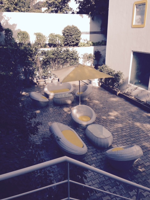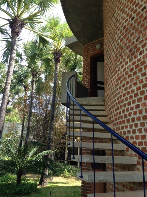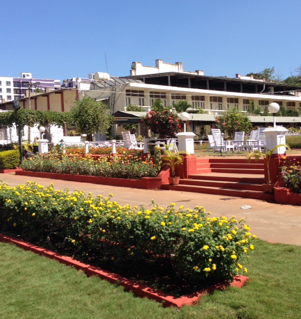 There he was , larger than life, standing on a massive stone and concrete structure . From the 4 directions there are sloping ramps which allow you to walk up to greet him, if you so desire. It seemed all so fitting- he was a man of the people. It was a warm, sunny day and I had my eyes open for a French cafe, as described in the guide book. Came upon a fancy hotel that had coffee, Internet, and air conditioning! Yippee ! We’ve been out of touch for a few days, so we had a Luxurious hour catching up on Face Book , sitting in a swanky restaurant, and having a pleasant breather. Then off we went to find the Sri Aurobindo ashram. The town is a refreshing change from the usually neglected looking India. The wide streets are tree lined and shady and this was the French part of town.