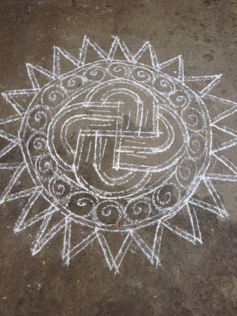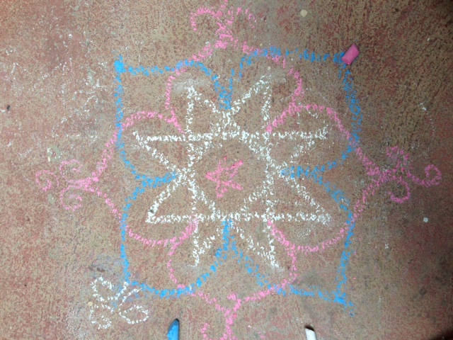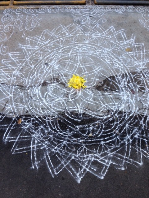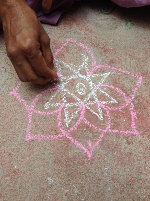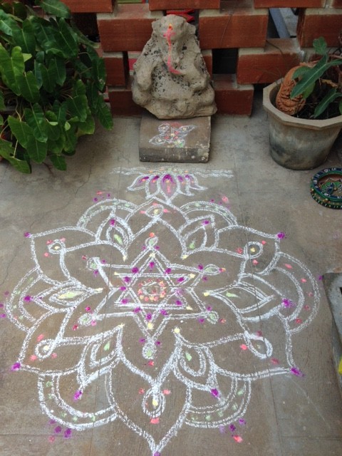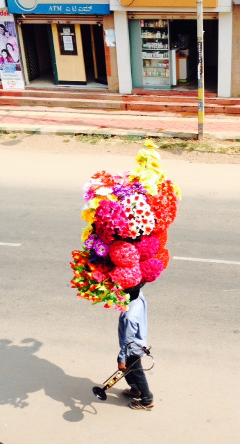 came out. Next, we followed the crowd into the court yard entrance where we found ourselves snaking around the palm trees and potted rose bushes towards a large table decorated and entirely covered with fresh flower blossoms in a design of a mandala. As we paraded by the table I did like the others- I bowed down, touching my forehead to the cool marble ledge. Then, I looked for a place among the nicely dressed crowd that was all seated on walkways and ledges and steps, and we settled down like the others, to