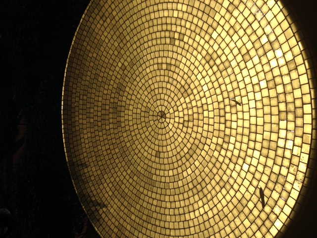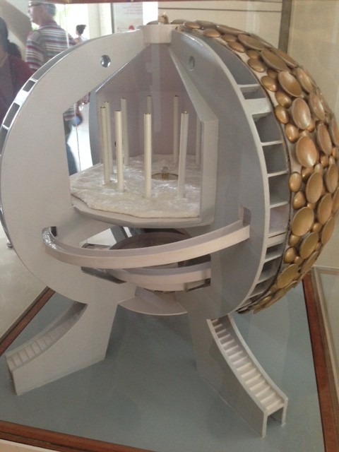 Once you enter the chamber, which is all white, circular and with 12 white columns situated around the room, you look for an available white cushion to sit on. Then you notice a shaft of light streaming down from the hole in the ceiling , shining right onto a large glass ball . It is quite a scene to take in and it feels like something is going to be happening- a concert or something- but we sat with the others and meditated – or Contemplated- or concentrated and then a light flashed twice, which was our signal to depart the Mother Ship.
