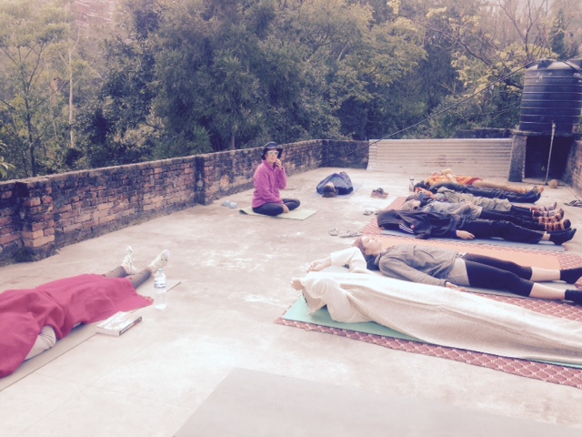 Then a staff member asked us if anyone would be willing to lead the Yoga Nidra class . I said Sure! So I went to the roof as everyone relaxed and I made up a bunch of words to make it interesting .