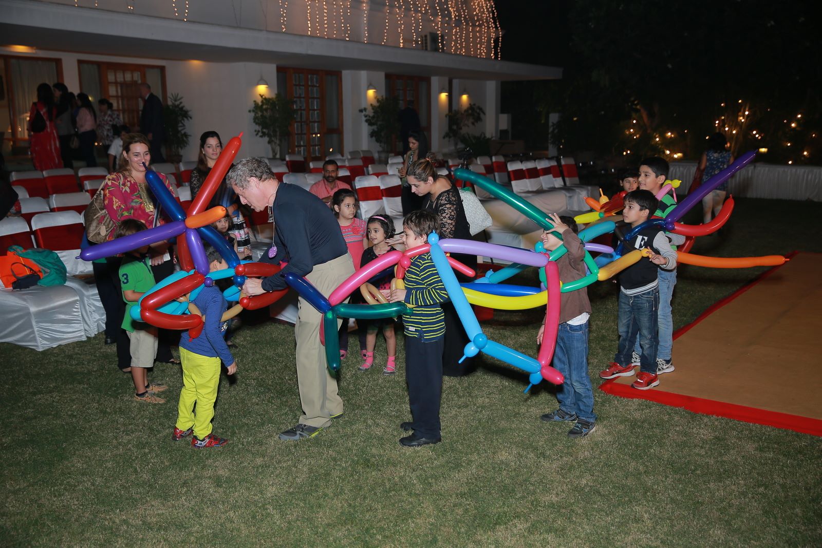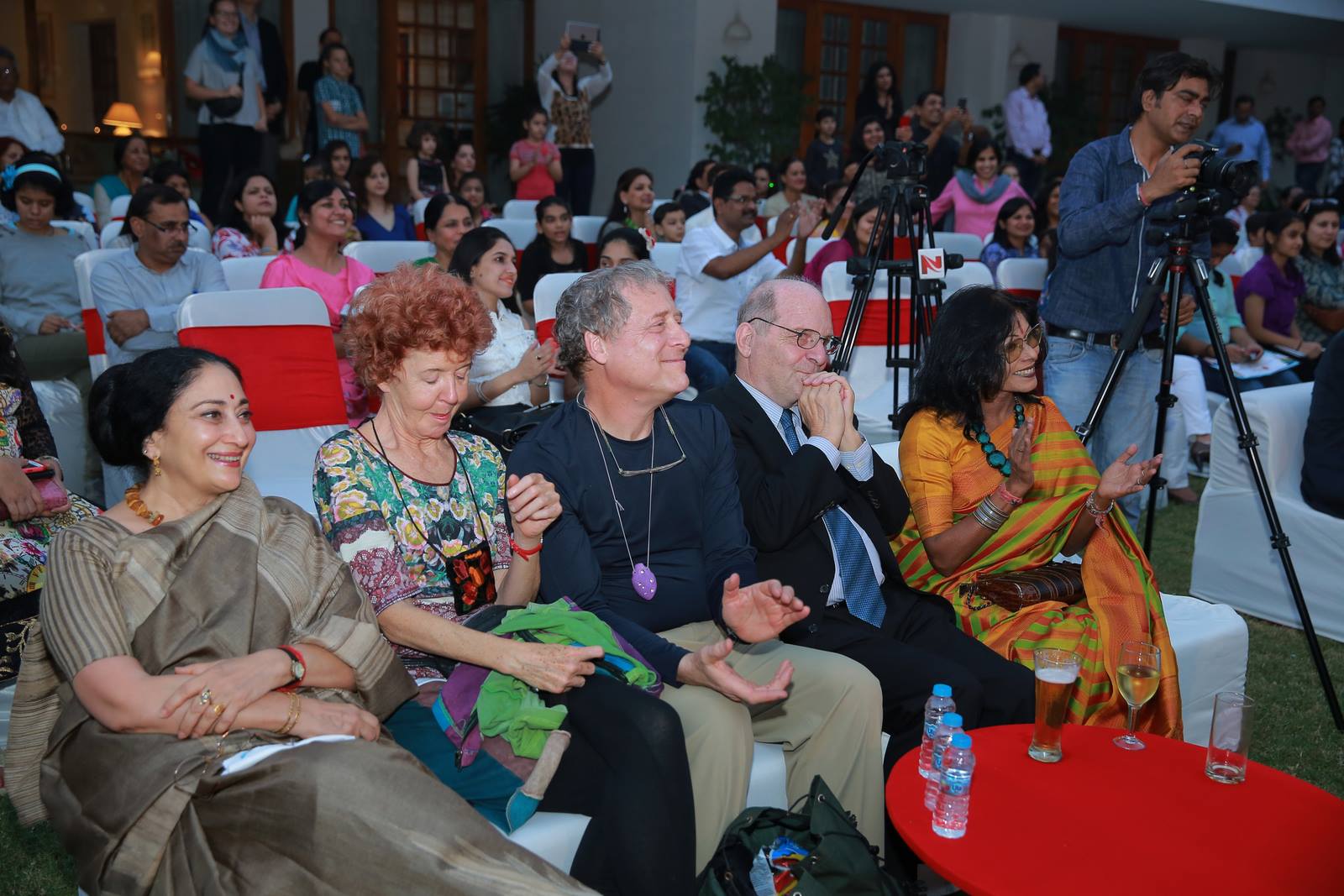 On our first day in Delhi our friend Sharon brought us to a bookopening event for kids with special needs. Someone at the event posted a number of pictures on Facebook the other day. Here’s a shot of us sitting with Sharon watching the event.. and then a shot of me adding a little unexpected color to the event.