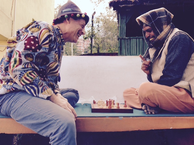 It’s been a good day at the Ashram (what a surprise). The Yoga students are all so friendly and come from so many countries. Annie and i are the only “guests” here who are in the 60’s… all the others are in their 20’s. They are in awe of Annie’s flexibility. She became an instant celebrity… then they found out her age and she became whatever the next stage is. She’ll be leading them in a fairytale yoga session tomorrow. Of course I’ve been doing balloons for the local kids each day. Tonight I did a balloon story for the other guests at the campfire (we have a campfire each night). They jumped into the story, no problems getting them to volunteer. Many of them whipped out their phone cameras. The head guru has given me a title: MHC (Most honorable Clown). He’s a chess player and has been playing one person here each day. His “partner” wasn’t here today and I had mentioned that I’d be up for game if he’d like. We played three. I won the first and determined to play totally “out of the box” to have fun and be sure to lose during the next game. I guess I totally confused him – I won the next three games. When we began game number 4 the bell for yoga class rang so I knocked my king over and said, I forfeit, you win!” we both laughed. In that yoga class there was one balancing pose (more than one) that I couldn’t even get close to. These students are serious, some are taking this ashram’s month-long yoga training course). I adjusted the pose, leaning one leg against the wall and anything else I could think of not to start a dominoes falling effect in the class. A couple of the students must have seen me because they began to laugh… the type of laugh you do in a serious situation when you aren’t aloud to laugh and try to fight it but it keeps burping out. It wasn’t intentional… and I felt guilty. I don’t believe they had an awkward laughing experience like that in one of these yoga classes before.